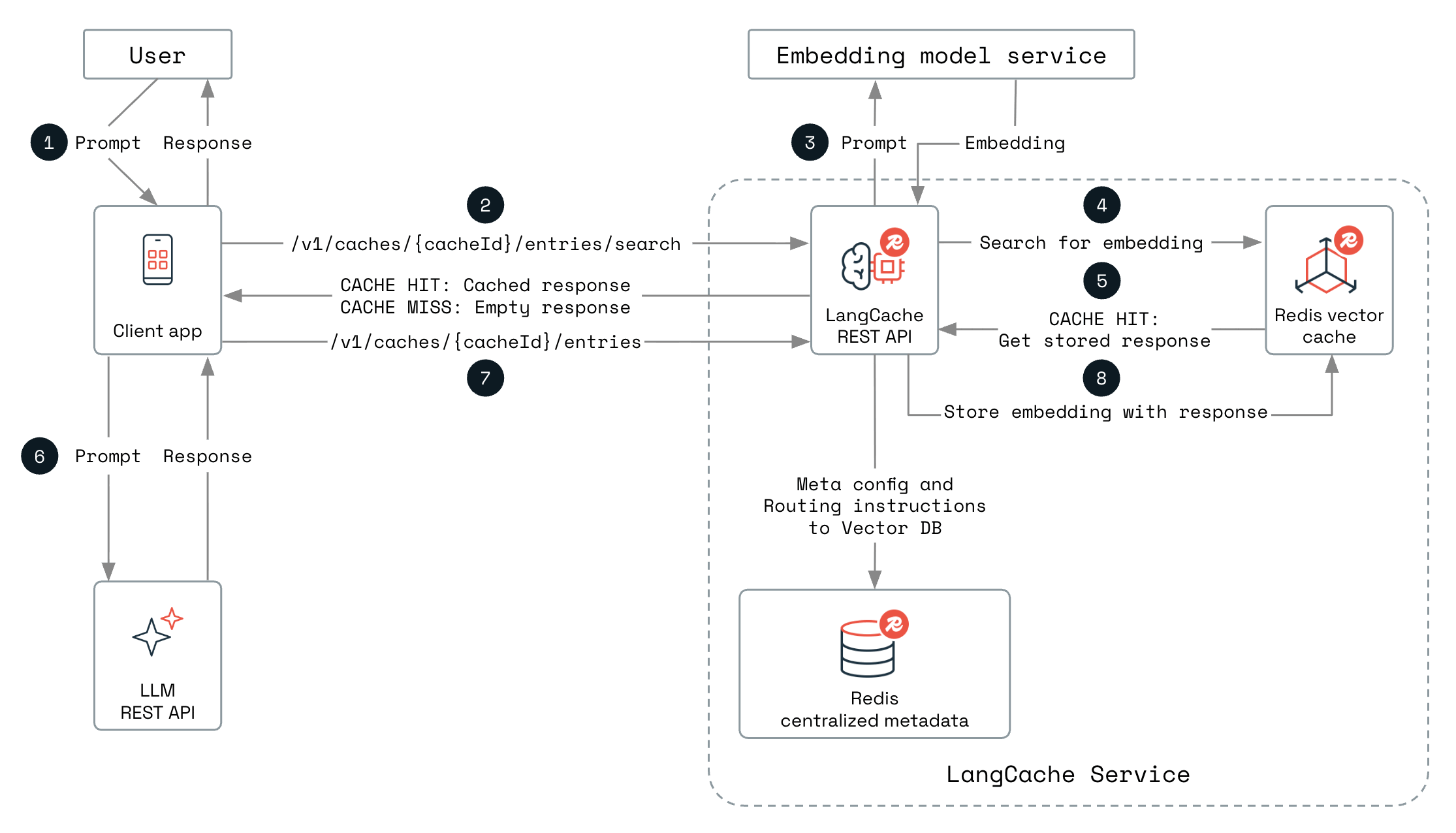 POST /v1/caches/{cacheId}/entriesendpoint. - LangCache stores the embedding with the new response in the cache for future use.