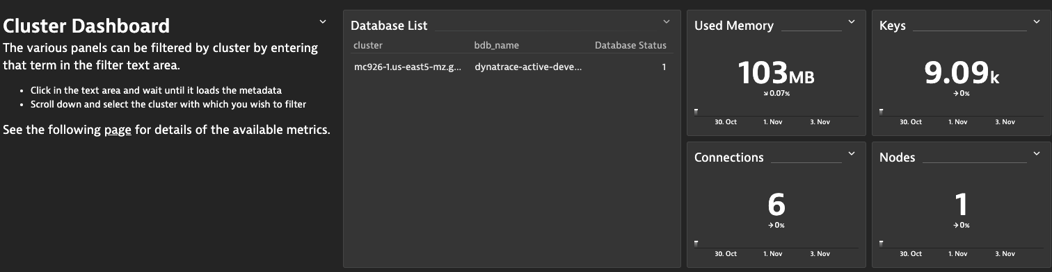 The Redis Software Integration for Dynatrace contains pre-defined dashboards to aid in monitoring your Redis Software deployment.