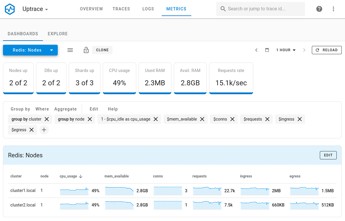 Because installing OpenTelemetry Collector and Uptrace can take some time, you can use the docker-compose example that also comes with Redis Software cluster.