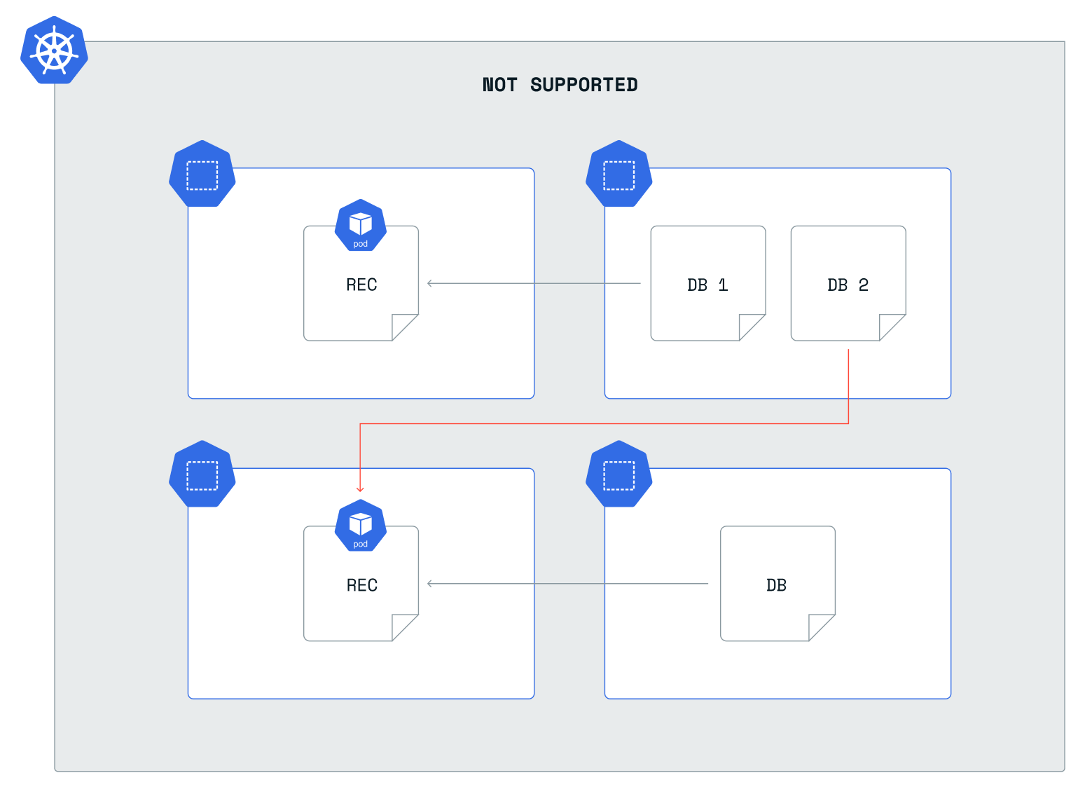Redis Enterprise for Kubernetes does not support operations that cross Kubernetes clusters. Redis Enterprise clusters (REC) work inside a single K8s cluster. Crossing clusters could result in functional and security issues.