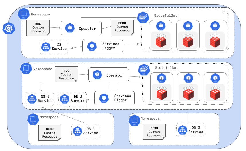 You have the flexibility to create databases in separate namespaces, or in the same namespace as the REC, or combine any of the supported deployment options above. This configuration is geared towards use cases that require multiple Redis Enterprise clusters with greater isolation or different cluster configurations.