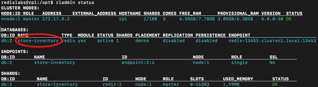 rladmin status modules- Shows the latest modules available on the cluster and the modules used by databases.rladmin status modules all- Shows all of the modules available on the cluster and the modules used by databases.