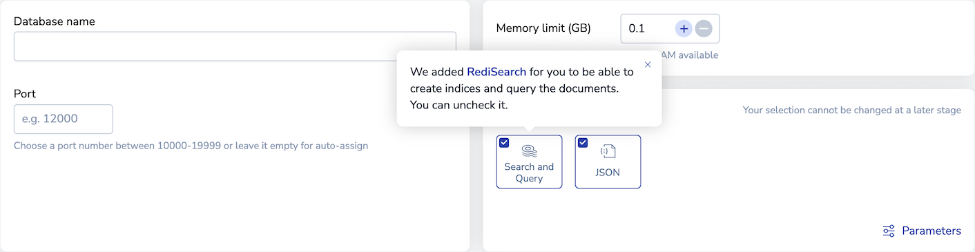 Note:When you select JSON, Search and Query is also selected by default to allow you to index and query JSON documents. If you do not want to use these additional features, you can clear the Search and Query check box. -