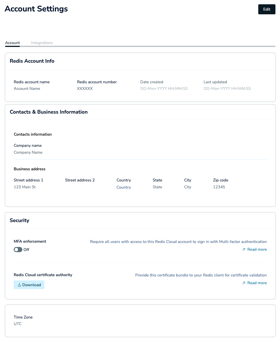 Use the Account tab of the Account Settings screen to review and update settings associated with your Redis Cloud account.