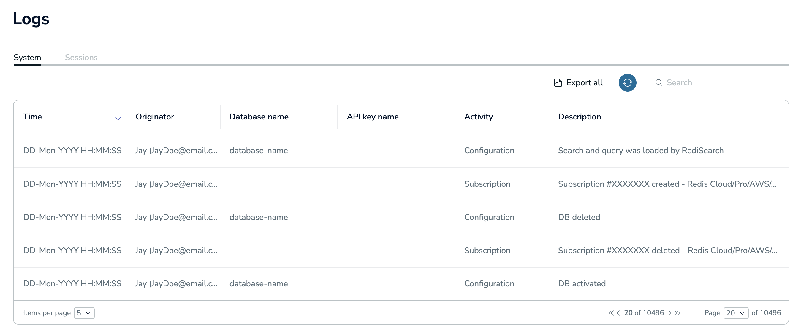 System logs collect and report actions performed on various entities in your Redis Cloud subscription. These entities include the account itself, users, API Keys, subscriptions, databases, accounts, payment methods, and more. For each entity, various lifecycle events are logged in the system log.