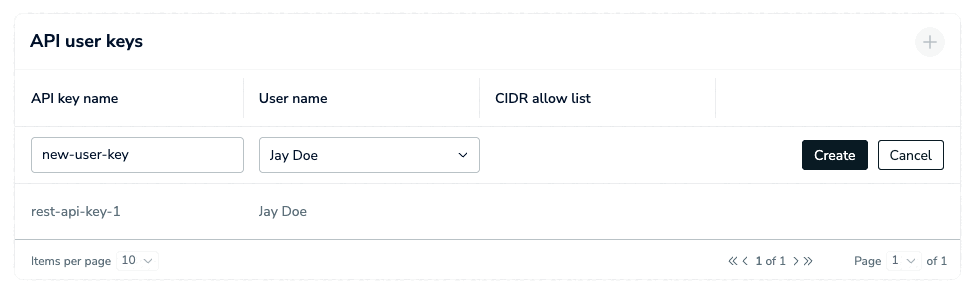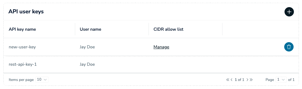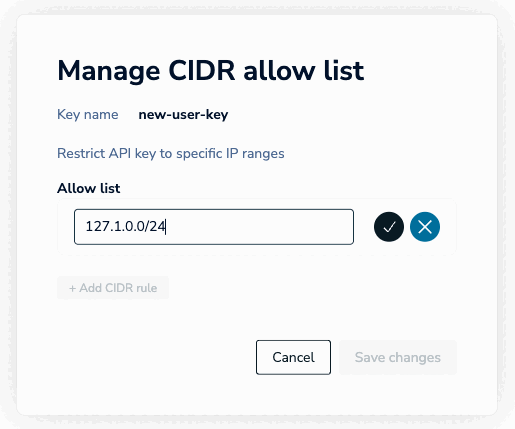 By default, REST API requests are allowed from all IP addresses. To limit access to specific addresses, define a CIDR allow list for the user key.