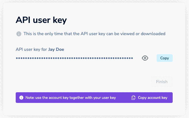 The Finish button is inactive until you copy the key to the clipboard. After you save the user key, you can also select Copy account key to save the account key.