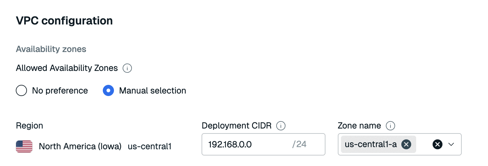 For Google Cloud clusters and Redis Cloud BYOC, select an availability zone from the Zone name list.