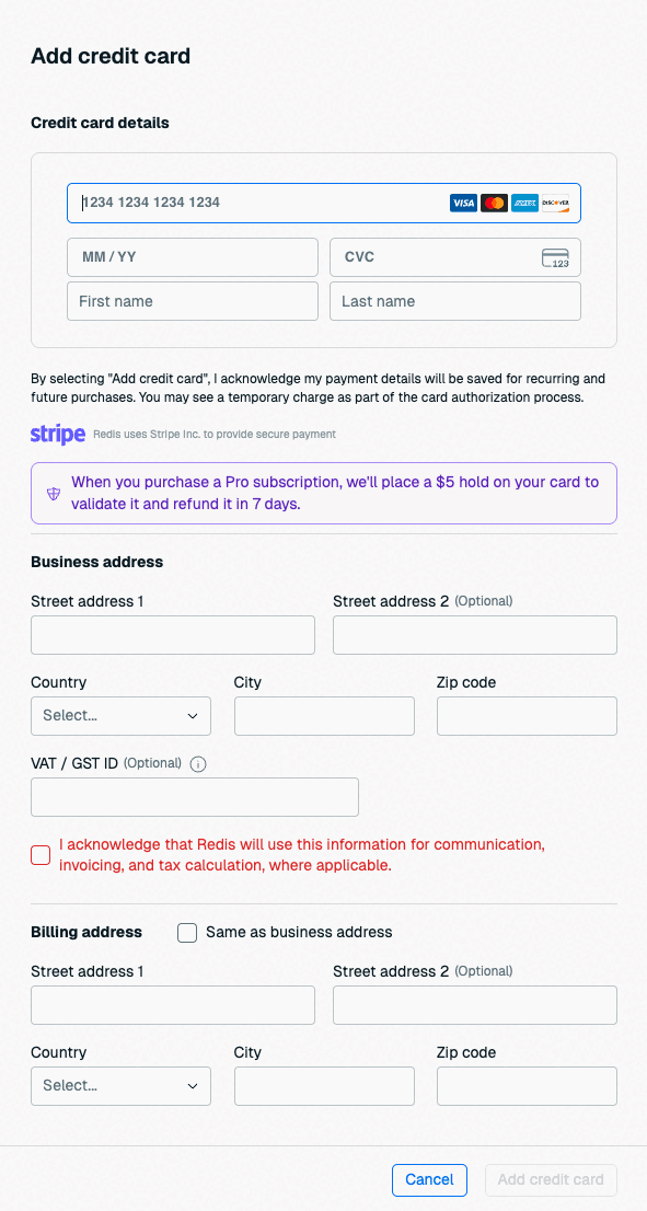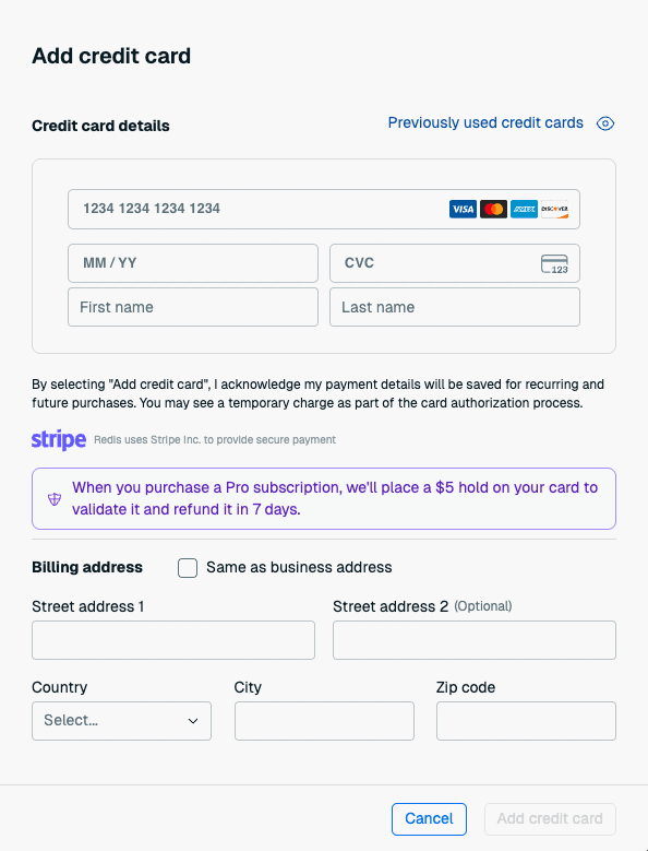 If you have not already added a business address to your account, you must enter one. Redis uses your business address for communication, invoicing, and tax purposes.