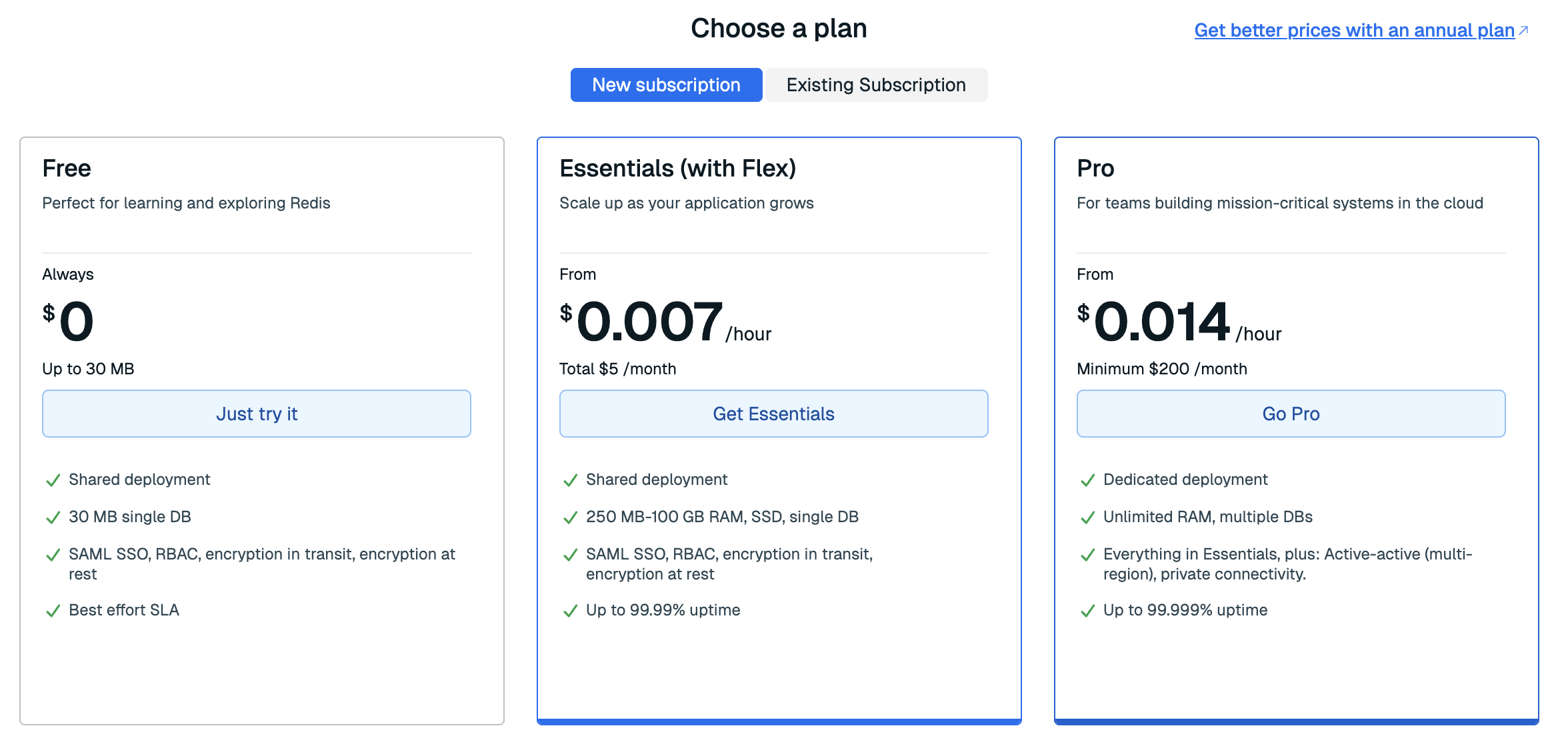 For a comparison of available plans, see Redis Cloud Essentials plans.