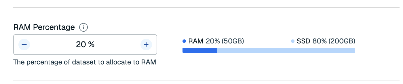 During the Sizing step, when you are provisioning your databases, you can select the RAM percentage for your database. The default is 20%, but you can select a percentage between 10% and 50%. Lower RAM percentages reduce cost but may increase latency, while higher RAM percentages improve throughput and latency at higher cost.