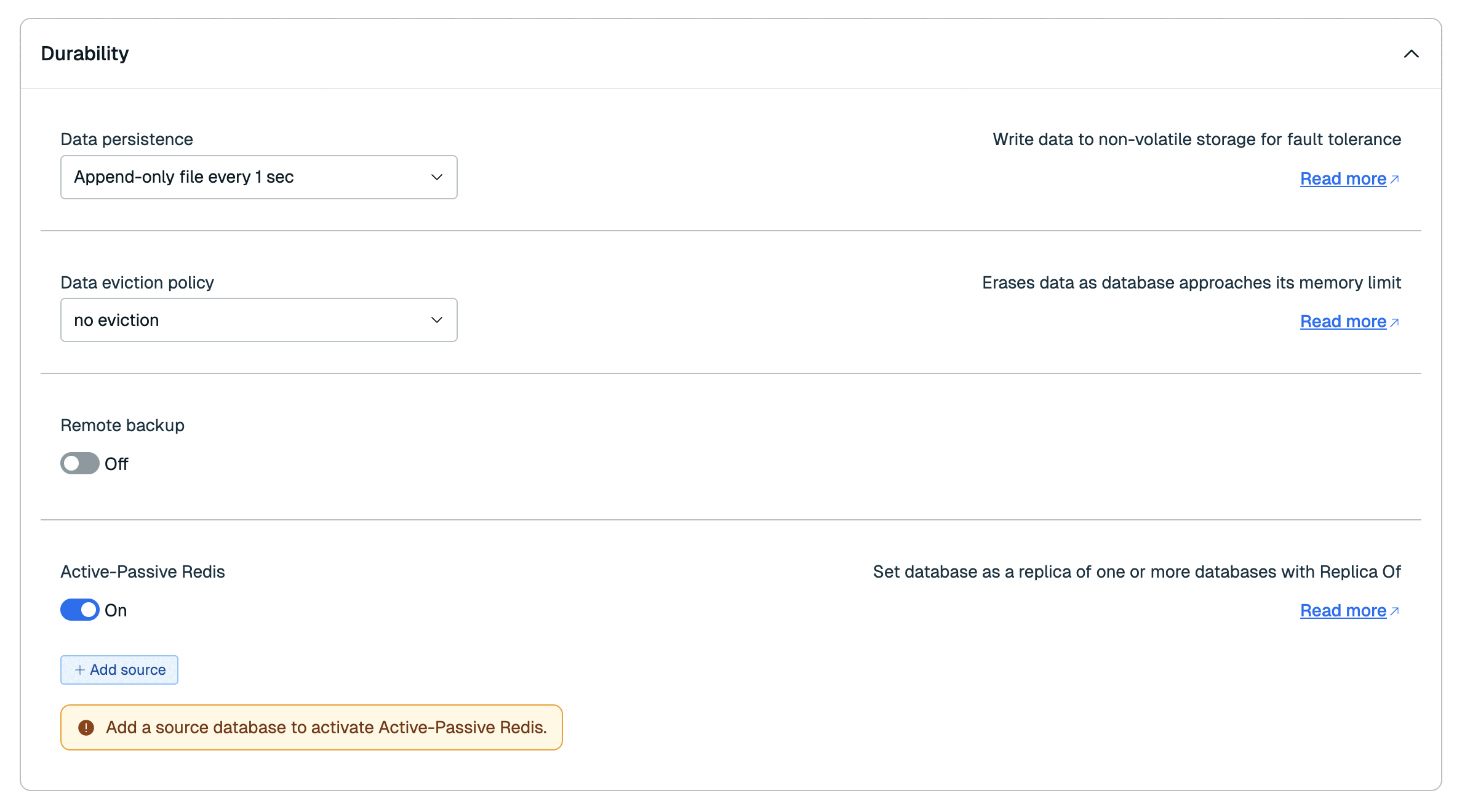 In the Durability section, enable Active-Passive Redis and then select Add Source.