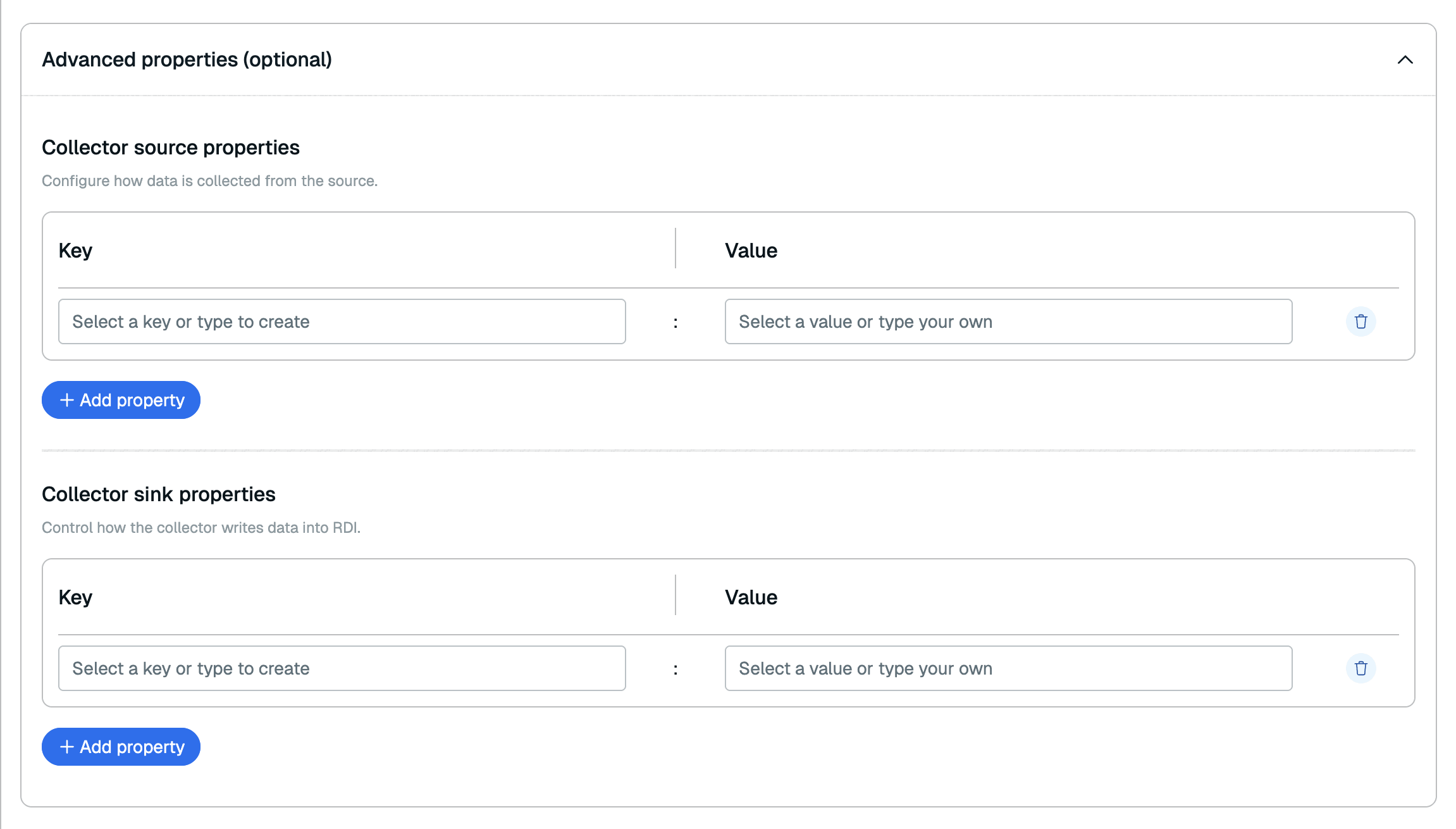 You can add any Debezium source property for your source database type in the Collector source properties section and any Redis server Debezium sink property in the Collector sink properties section. -