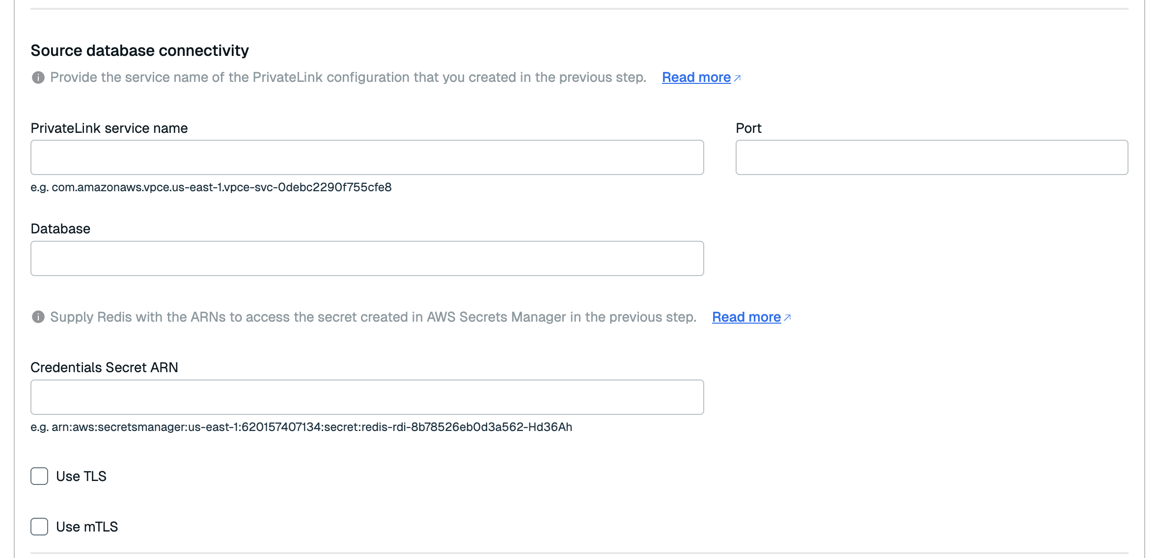 If your database requires mTLS, select Use mTLS. Enter the ARN of your Client certificate secret in the Client Certificate Secret ARN field and the ARN of your Client key secret in the Client Key Secret ARN field.