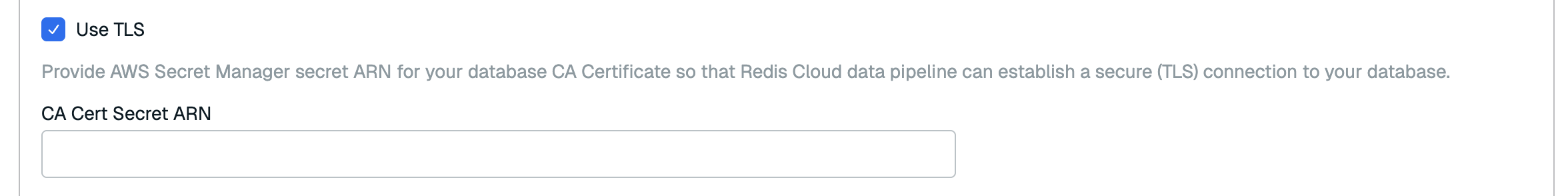 If your database requires TLS, select Use TLS. Enter the ARN of your CA certificate secret in the CA Cert Secret ARN field.