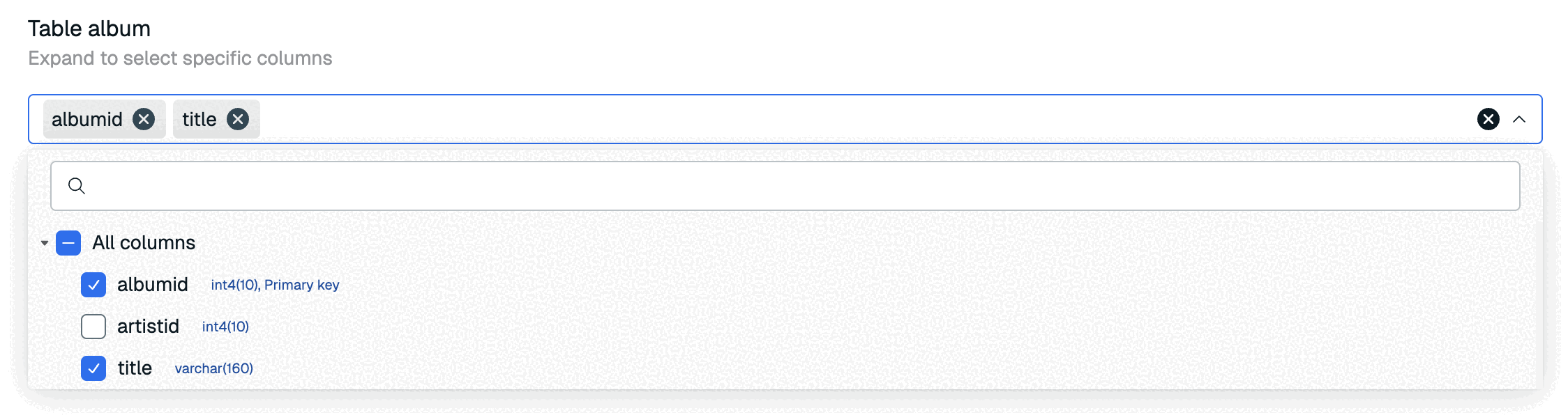 | Name | Name of the data stream. Each stream corresponds to a table from the source database. |