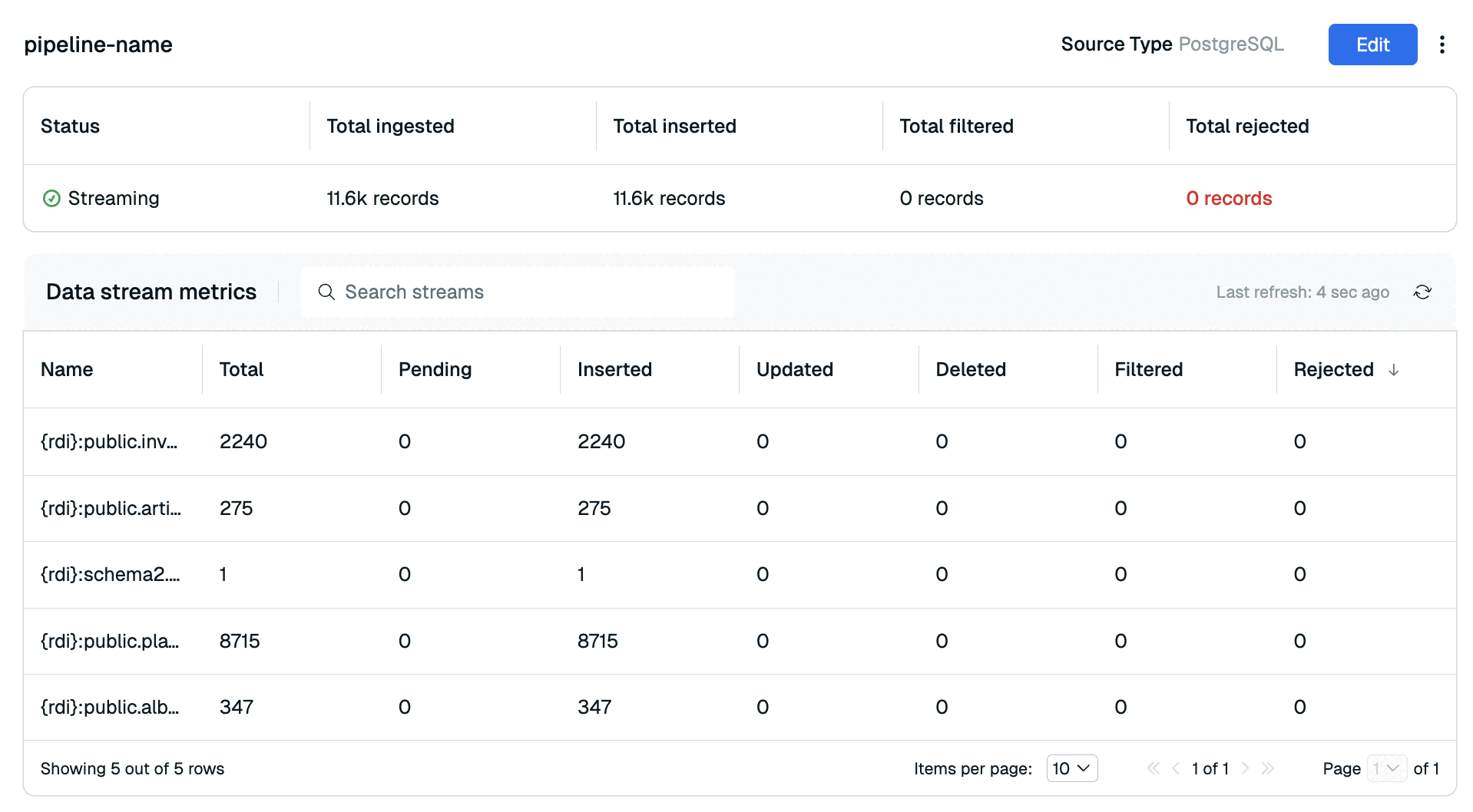 Status Description Initial Sync The data pipeline is ingesting all records from the source database into the target database. Streaming The data pipeline is capturing new changes from the source database as they happen. Changes in the source database are added to the target database within a few seconds. Stopped The data pipeline has been stopped. Error There is an error in the data pipeline. Reset the pipeline and contact support if the issue persists. - Total ingested: Total number of records ingested from the source database.
