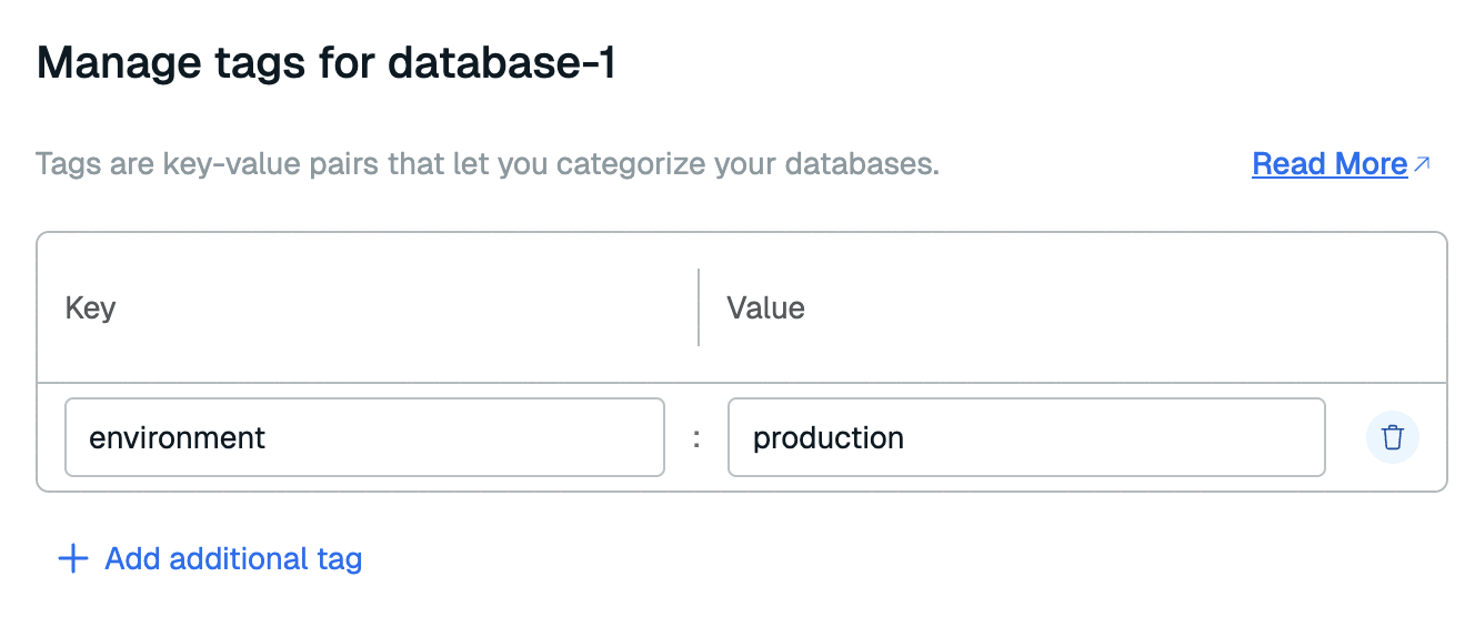 Tags are key-value pairs that let you categorize your databases. You can create tags and add them to your databases to associate them with each other. Once you've added tags, you can filter your databases in the database list or in the cost report by tag key or value.
