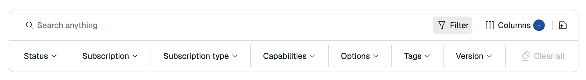 You can filter the list on Status, Subscription, Subscription Type, Capabilities, Options, Tags, and Version.