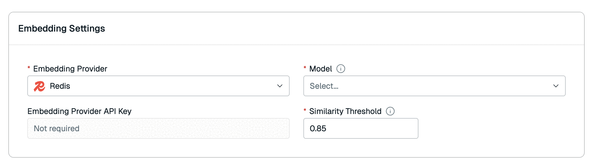 | Embedding Provider | The embedding provider to use for your service. Select between Redis, OpenAI, and Bring your own. Any embedding provider you use must support the OpenAI embeddings API. |