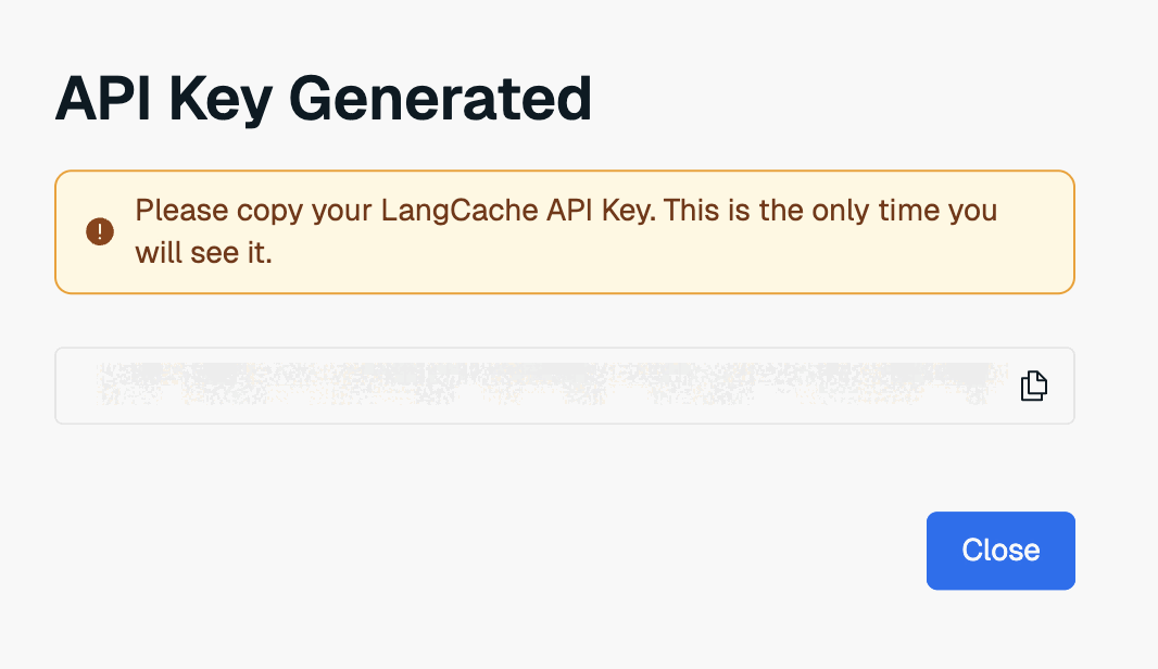 A window containing your LangCache service key will appear. Select Copy to copy the key to your clipboard.