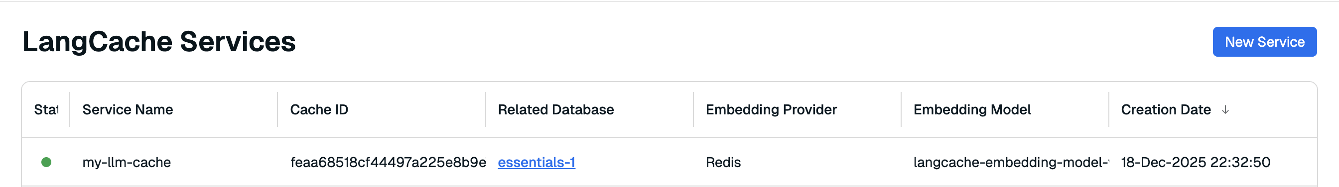 You'll be taken to your LangCache service's Configuration page. You'll also be able to see your LangCache service in the LangCache service list.