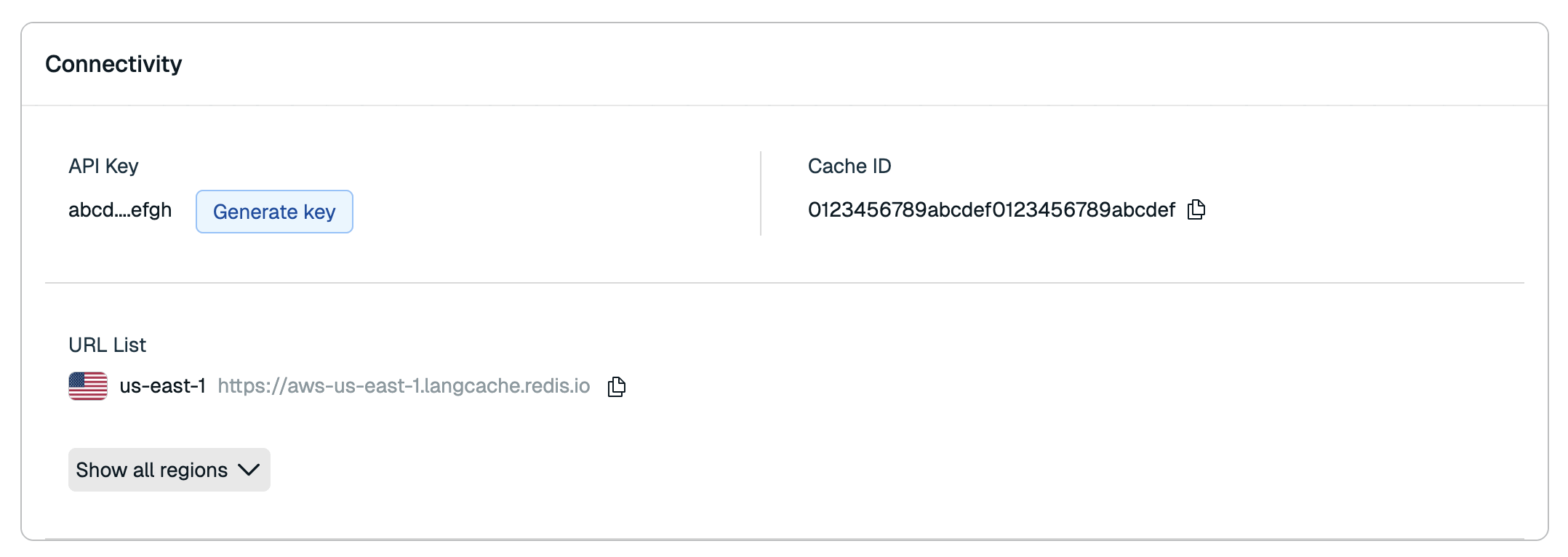 Select the Copy button next to the Cache ID and API Base URL to copy them to the clipboard. If you lost the API key value or need to rotate the key, you can generate a new service API key at any time.