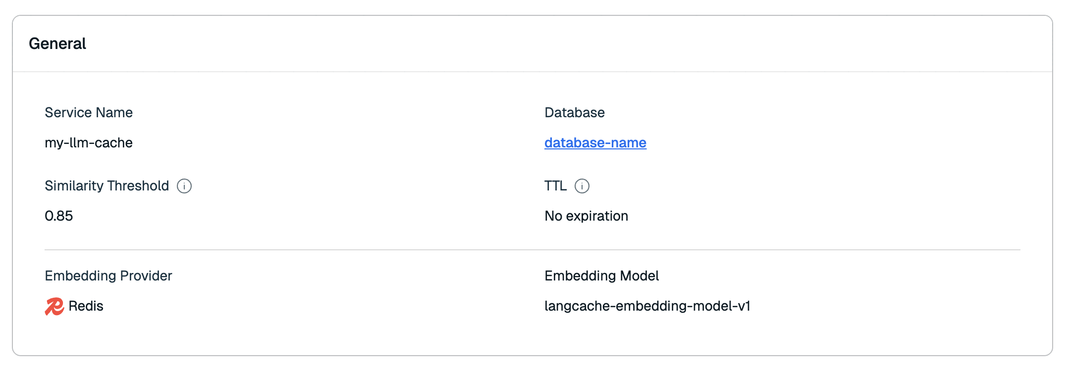 - The General section provides the cache settings for your LangCache service.