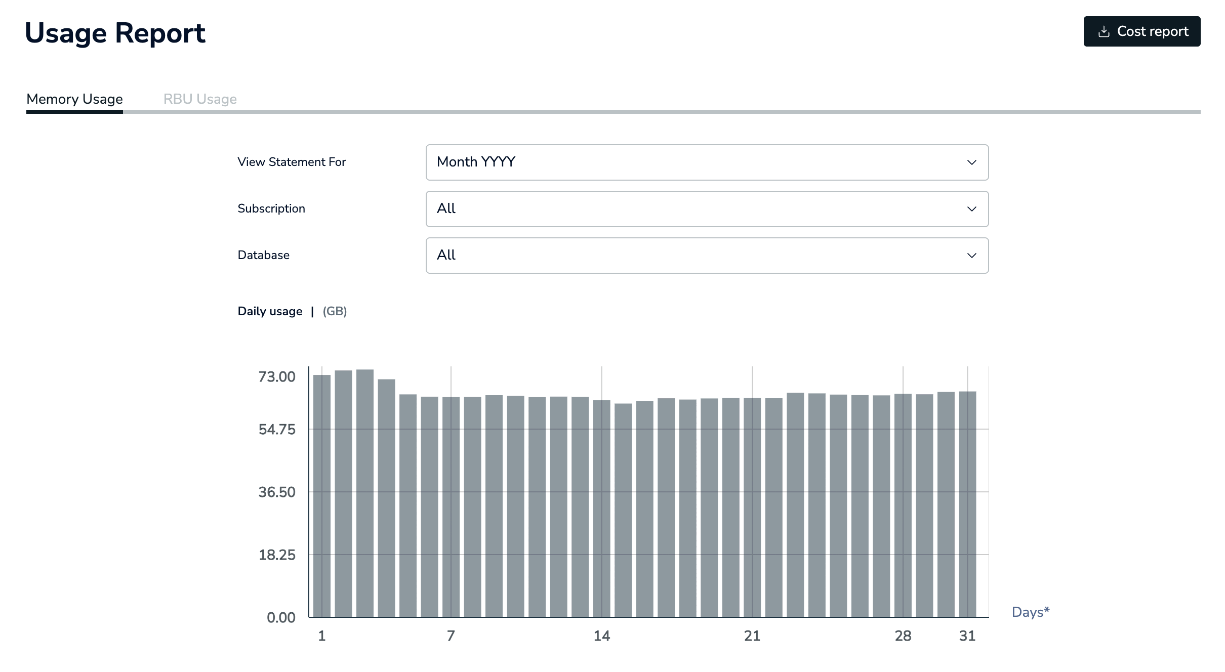 The Usage Report shows the daily memory usage and shard usage of all databases from the subscriptions associated with your account.