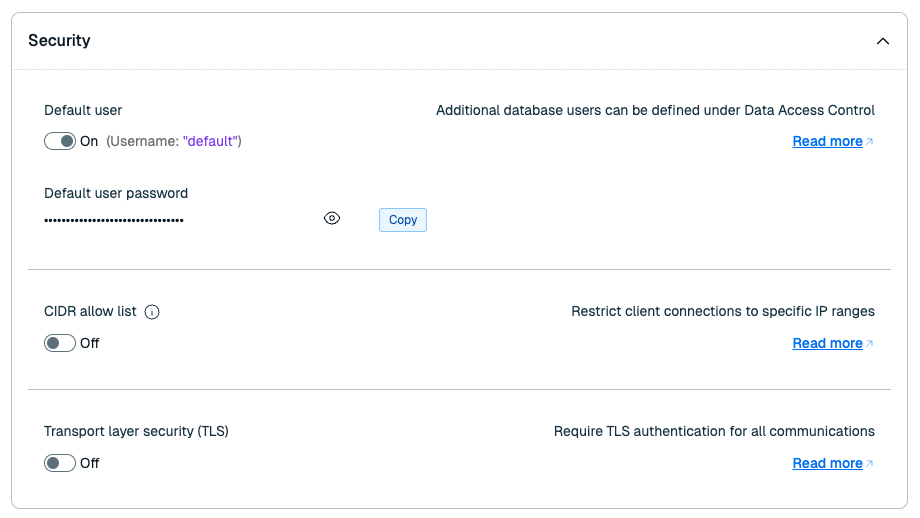 To connect to your database, you need your username and password. Each database is protected by a Default user called default and a masked Default user password. Select the eye icon to show or hide the password.