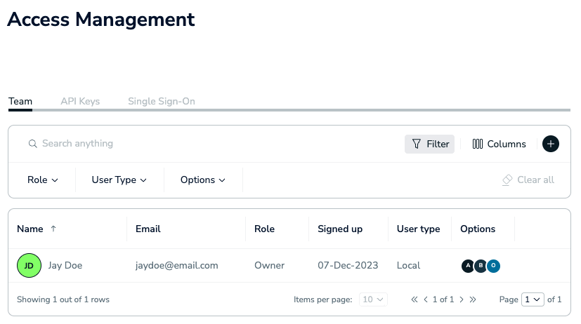 You can also use the list search to find a specific user or filter by Role, User Type, or Options.