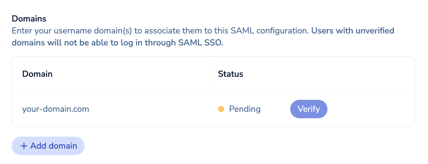 We'll check the domain's DNS records for the provided TXT record. If the TXT record does not exist or we can't resolve your domain, we won't be able to verify the domain and users with that domain won't be able to sign in using SAML SSO.