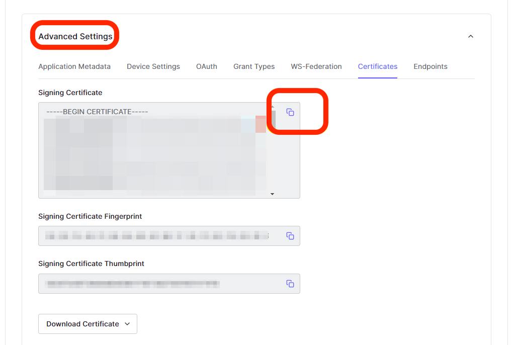 From the newly created application, go to Settings > Advanced Settings > Certificates.