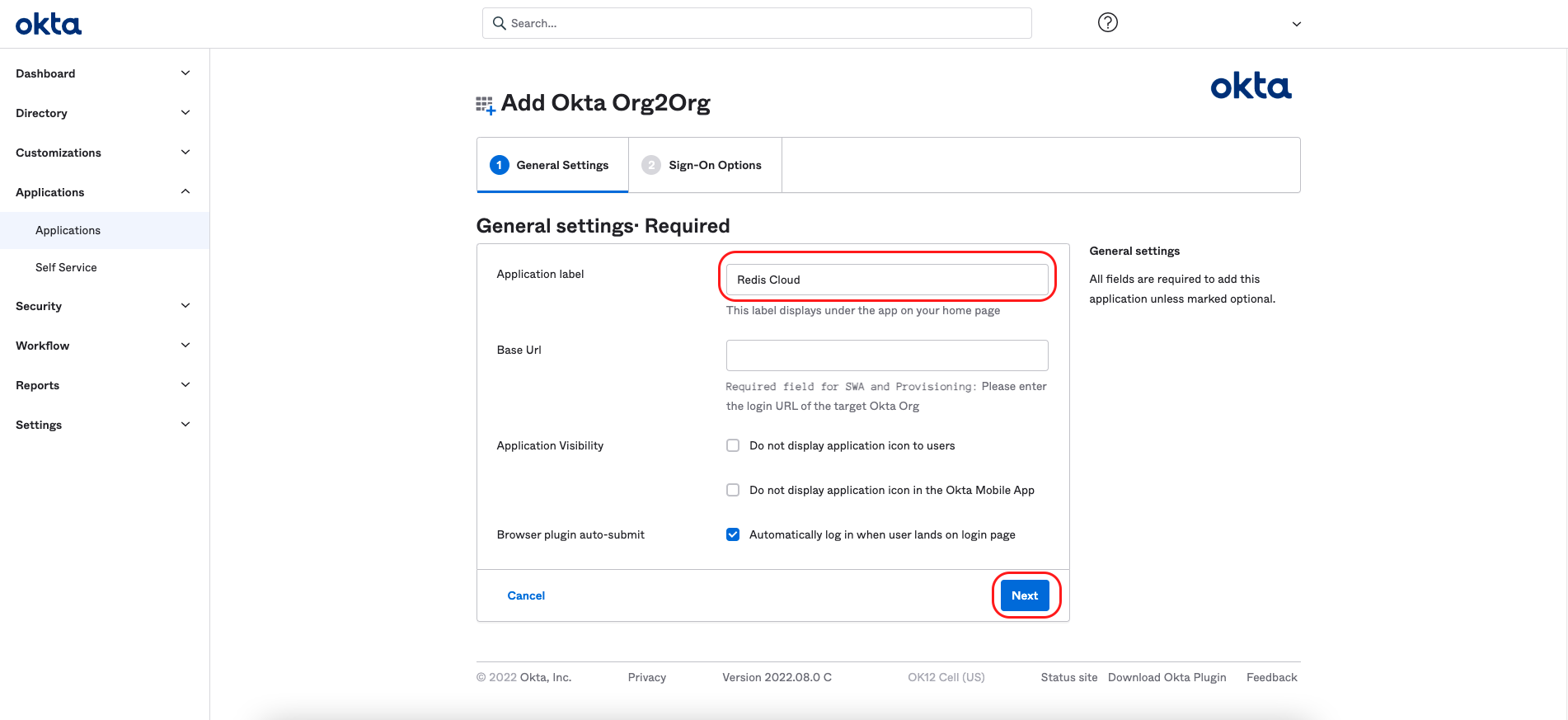 Enter this field for the Org2Org application General Settings section and select Next: