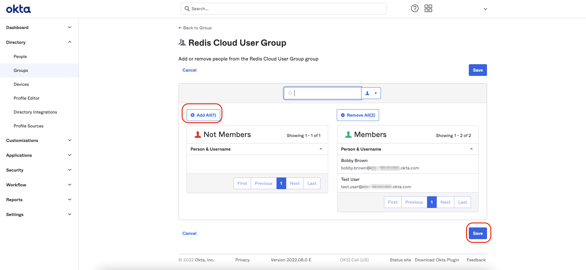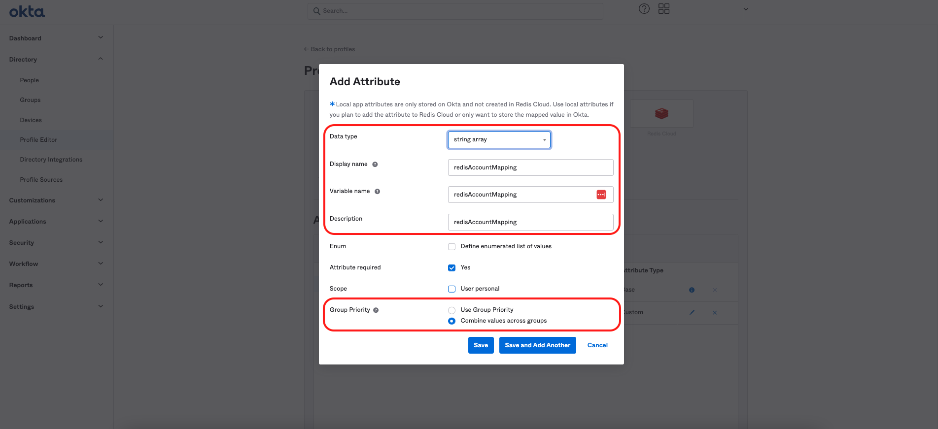In the left menu, select Directory > Profile Editor, then select Redis Cloud User.