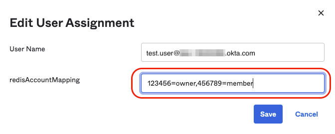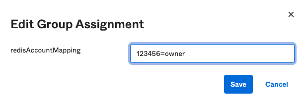 Now, define the Redis account mapping string default for this group and select Save and go back. The key-value pair consists of the lowercase role name (owner, member, manager, billing_admin, or viewer) and your Redis Cloud Account ID found in the account settings. Select "Done".