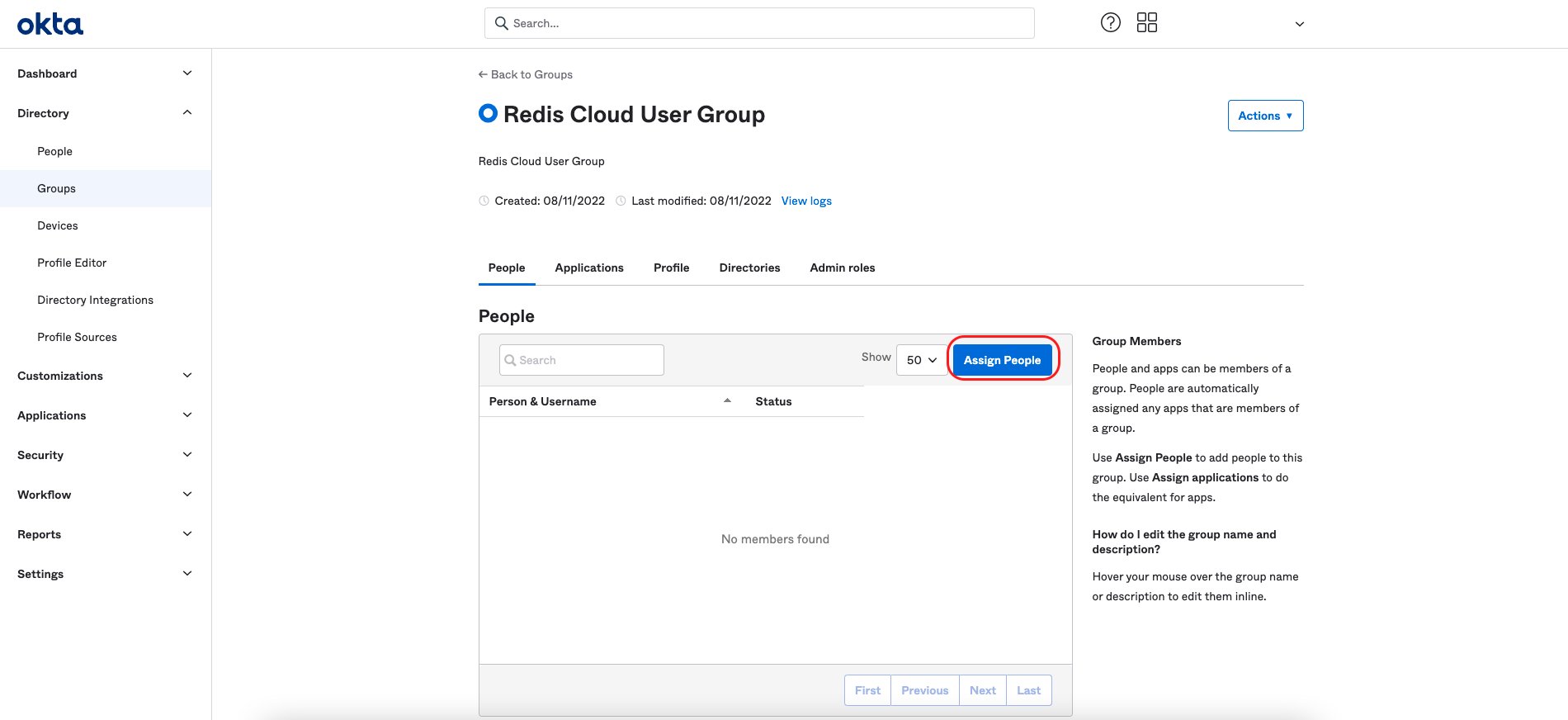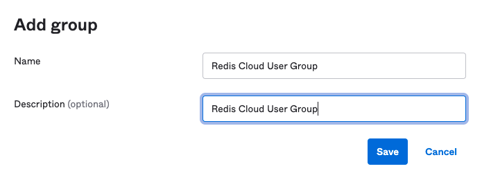 Now that our SAML IdP is configured, create an Okta group and assign the Redis Cloud application.