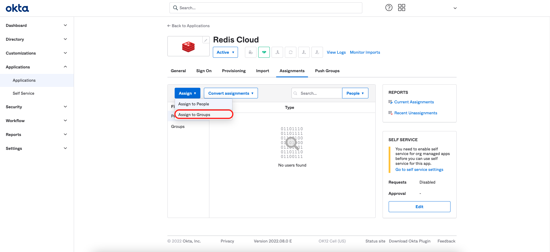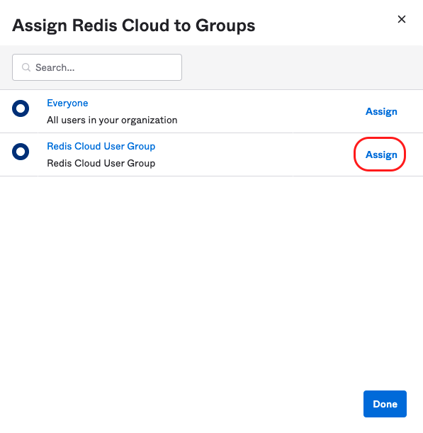 From the menu, select Applications > Applications > Redis Cloud. Then, select Assign to groups.