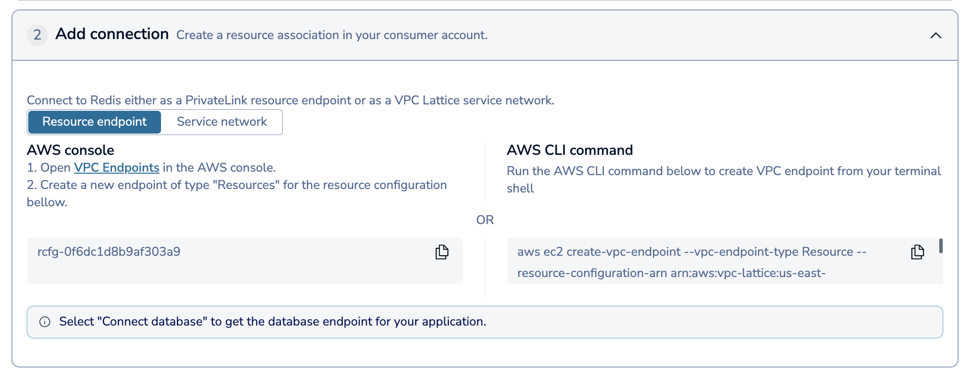 Here, choose whether you want to connect to Redis using a Resource endpoint or a Service network.