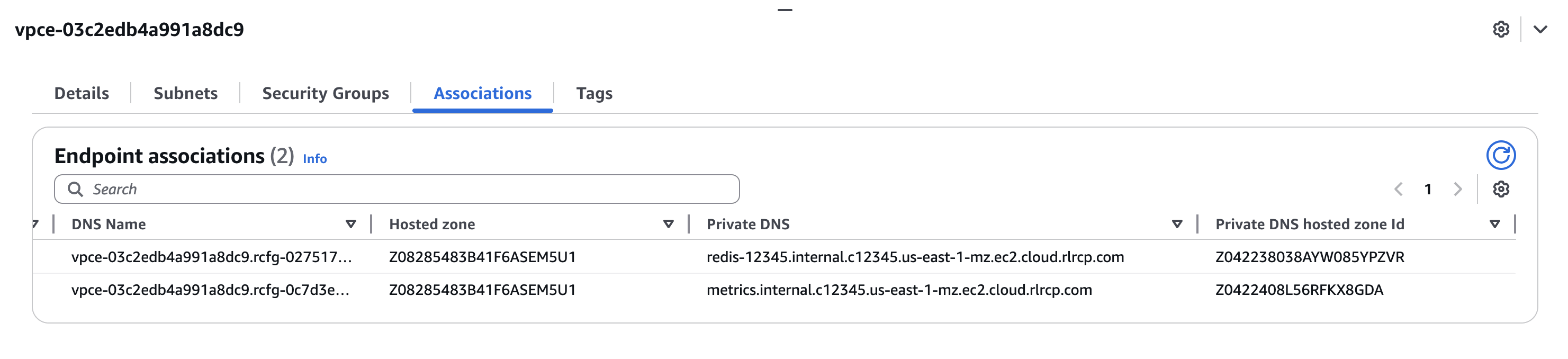 After you've connected to Redis Cloud with a VPC resource endpoint or a VPC lattice service network, you can find the endpoints for your databases and cluster metrics in the AWS UI by going to the Associations tab for your endpoint or service network and viewing the Private DNS entries. You will have one entry for each database and one entry for the metrics endpoint.