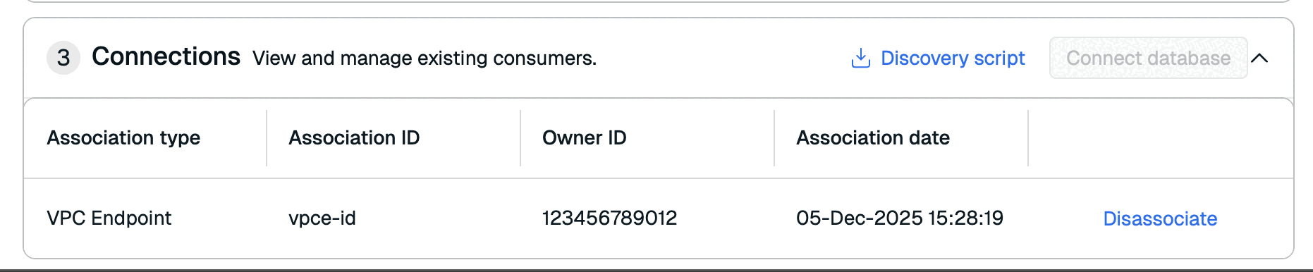 The script returns a list of database endpoints that you can connect to from your consumer VPC.