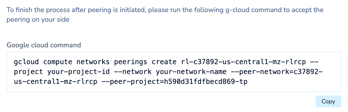 Copy the Google cloud command after you enter the other VPC peering settings. You need this command to accept the peering request later: