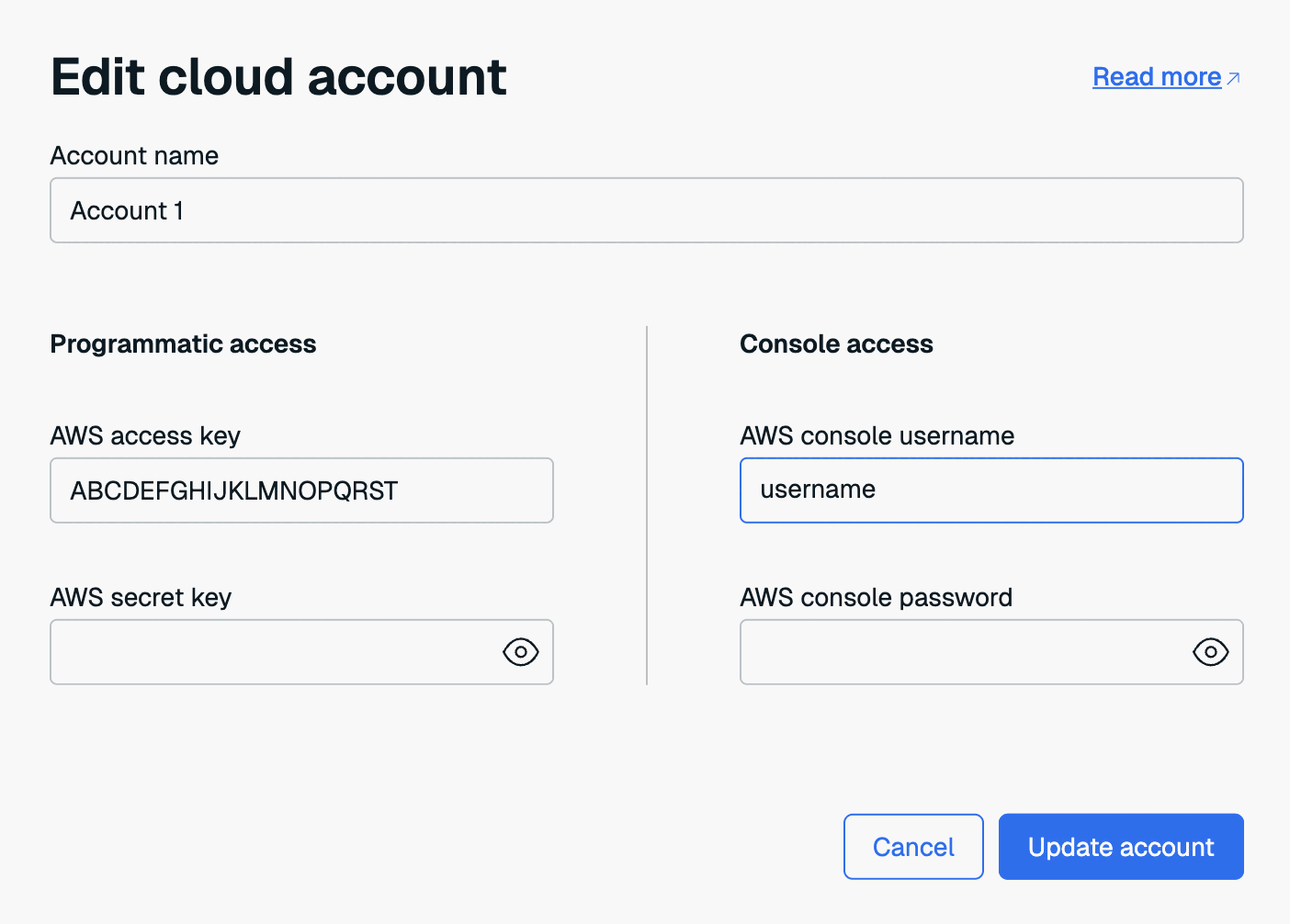 | AWS access key | The AWS access key for the programmatic user created to support your cloud account settings |
