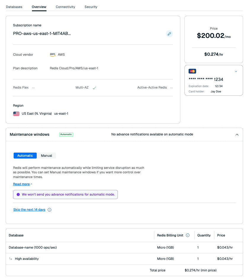 The Redis price panel breaks down your subscription price.