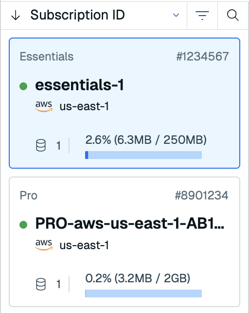 Your subscription details appear, along with a summary of your database details.