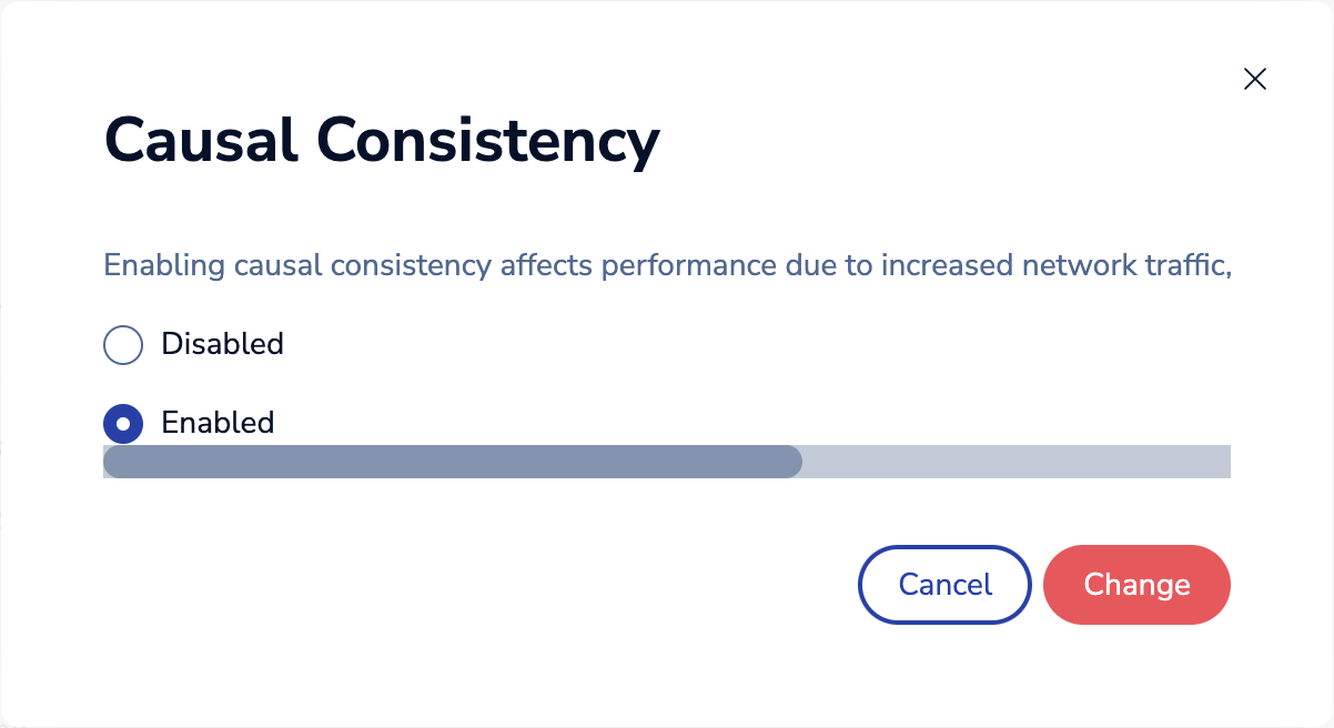 After database creation, you can only turn causal consistency on or off using the REST API or crdb-cli.