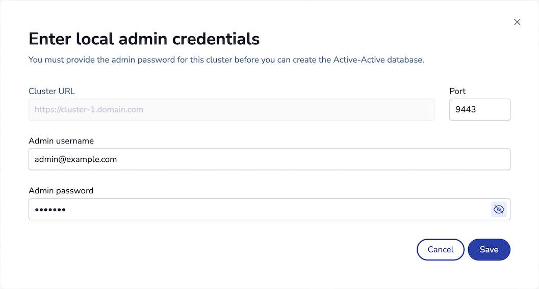 - Add participating clusters - Add the participating clusters to the Active-Active database with the user credentials for the service account.