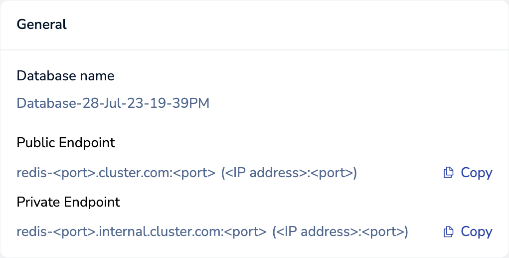 To connect to your database, you need the database endpoint, which includes the cluster name (FQDN) and the database port. To view and copy public and private endpoints for a database in the cluster, see the database’s Configuration > General section in the Cluster Manager UI.
