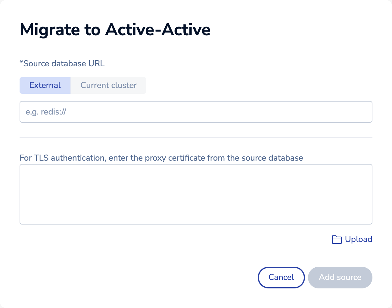 In the Migrate to Active-Active dialog, select External:
