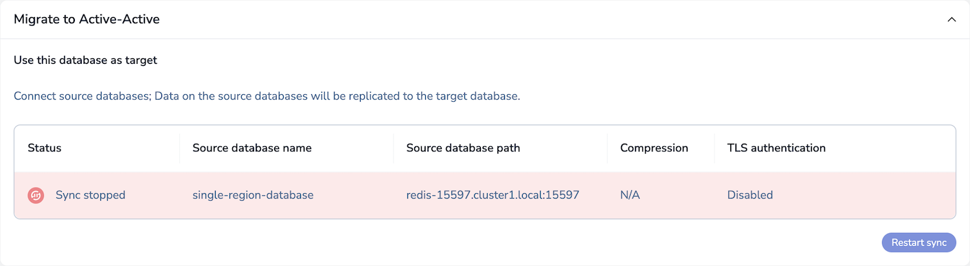 In the Migrate to Active-Active section, click Stop sync: